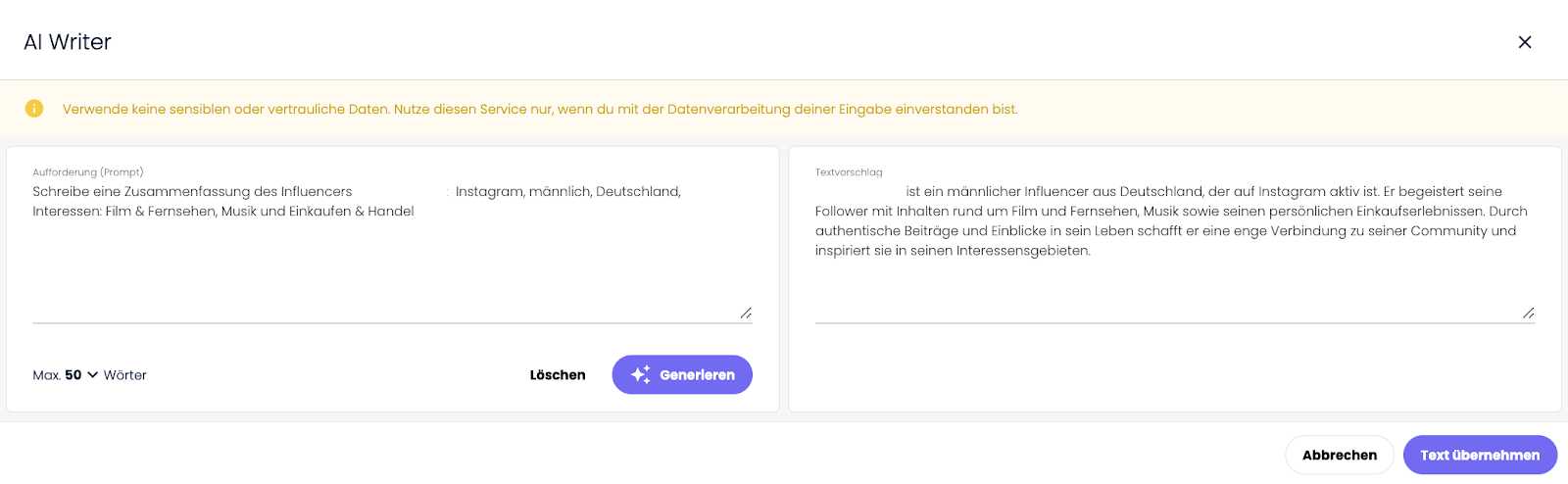 Tools wie IROIN® erleichtern die Arbeit mit Sedcards und Discovery Reports erheblich. IROIN® erstellt automatisch Sedcards aus vorhandenen Creator-Daten und ergänzt diese durch den AI Writer mit professionellen Beschreibungen. Die fertigen Sedcards und Discovery Reports lassen sich direkt als PowerPoint, CSV-Datei oder über einen Link für Teams und Kunden exportieren. Stellar Tech liefert Analyse- und Reporting-Funktionen, die Reichweite, Engagement und Zielgruppen-Überschneidungen automatisch auswerten. Marken können mehrere Creators in Echtzeit vergleichen, fundierte Entscheidungen treffen und Kampagnen effizient steuern. Gemeinsam sorgen beide Tools dafür, dass Sedcards nicht nur optisch ansprechend, sondern auch datenbasiert und praxisnah erstellt werden.